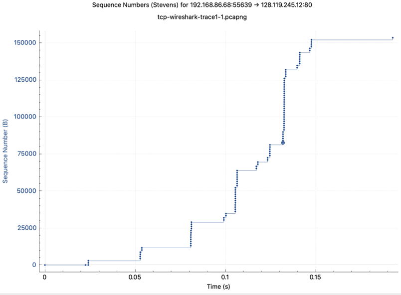 Use the Time-Sequence-Graph(Stevens) plotting tool to view the sequence number versus time plot of segments being sent from the client to the gaia.cs.umass.edu server. Consider the “fleets” of packets sent around t = 0.025, t = 0.053, t = 0.082 and t = 0.1. Comment on whether this looks as if TCP is in its slow start phase, congestion avoidance phase or some other phase. Figure 6 shows a slightly different view of this data.